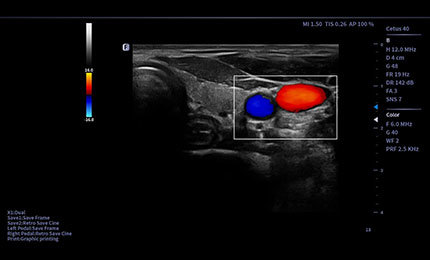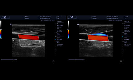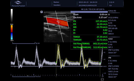 A medição da área vascular permite medir automaticamente a velocidade do fluxo sanguíneo em todo o espectro e, em seguida, exibir os resultados do fluxo sanguíneo.