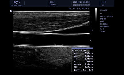 Reconhecimento automático e medição da espessura da membrana interna - mídia. Podem ser medidos os vasos sanguíneos esquerdo e direito, paredes anteriores e posteriores.